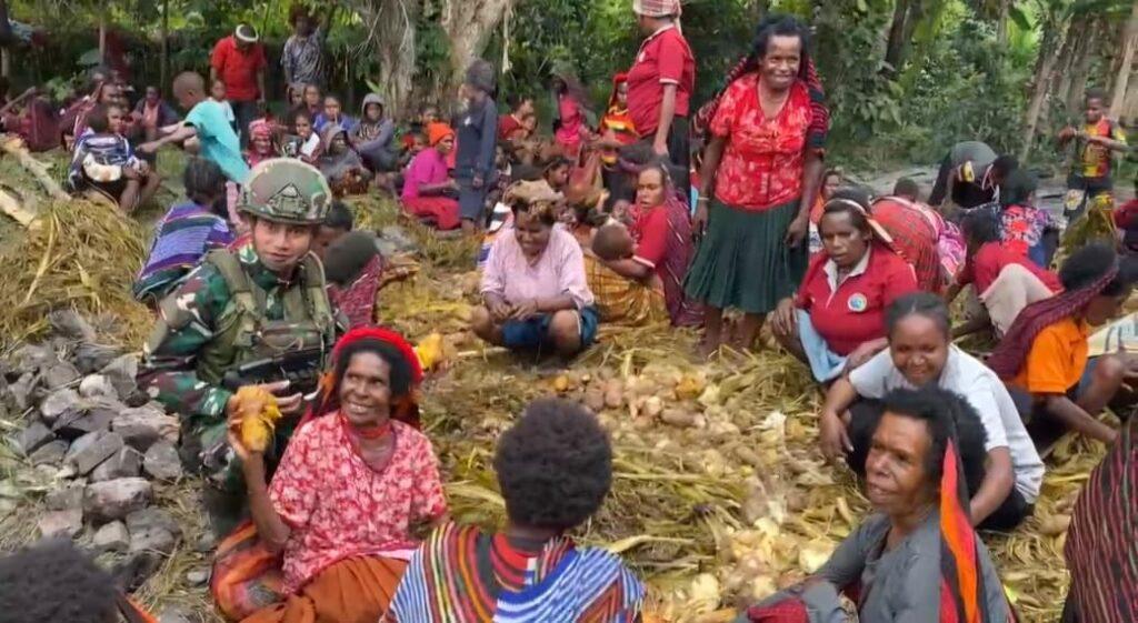 Kurima, — Kehadiran TNI di tengah masyarakat tidak hanya berfokus pada tugas pengamanan, tetapi juga membangun kedekatan dan kebersamaan dengan masyarakat. Hal tersebut diwujudkan oleh Satgas Yonif 521/DY melalui kegiatan Pembinaan Teritorial (Binter) dengan menghadiri dan ikut serta dalam ritual adat bakar batu bersama masyarakat di Distrik Kurima, Kabupaten Yahukimo, Papua Pegunungan. (6/3/2025).