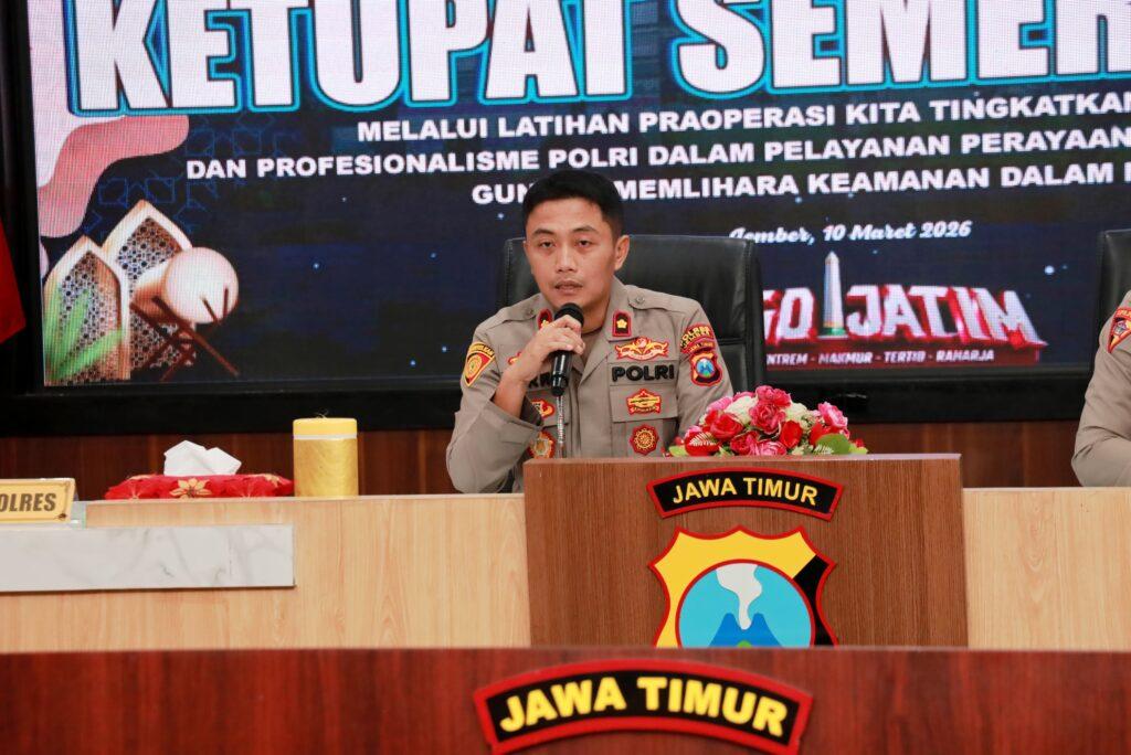 JEMBER, – Menjelang pelaksanaan Operasi Kepolisian Terpusat Ketupat Semeru 2026 dalam rangka pengamanan Hari Raya Idul Fitri 1447 H, Polres Jember menggelar Latihan Pra Operasi (Latpraops) sebagai bentuk kesiapan personel dalam menghadapi meningkatnya aktivitas masyarakat selama musim mudik dan libur Lebaran.